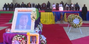 Rais Magufuli pamoja na waombolezaji wengine (waliokaa juu) wakati wa kuaga mwili.