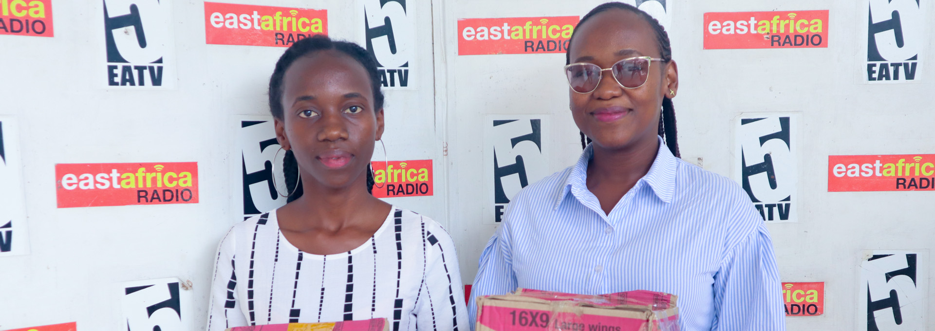 Sekela Lass (kushoto) na Mpoki Johnson wakikabidhi mchango wao katika ofisi za East Africa TV na East Africa Radio. Wameshawishika kuchangia taulo za kike pakiti 32 baada ya kuona tangazo kwenye TV