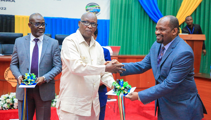 Naibu Waziri wa Fedha na Mipango, Mhe. Hamad Hassan Chande (Mb) akimkabidhi Afisa Mtendaji Mkuu wa Mamlaka ya Udhibiti wa Ununuzi wa Umma (PPRA), Bw. Eliakim Maswi, Kanuni za Maadili ya Watumishi wa Umma na wazabuni wanaoshiriki katika shughuli za Ununuzi wa Umma, baada ya kuzinduliwa, jijini Dodoma.