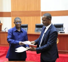 Katibu wa Wizara ya Fedha na Mipango dkt Emmanuel Tutuba(Kushoto mwenye miwani)akipokea ripoti ya mali zilizotumika katika uhalifu kutoka kwa DPP.