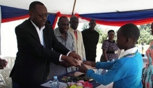 Mwanafunzi akipokea zawadi baada ya kufaulu