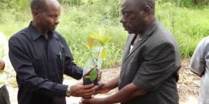 Mwenyekiti wa Bodi ya Wadhamini ya Mamlaka ya Uendelezaji wa Zao la Korosho, Bw. Athuman Nkinde (kushoto), akikabidhi mche bora wa zao la korosho kwa mmoja wa wadau wa zao hilo.