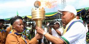 Kiongozi wa mbio za mwenge Racheal kassanda akikabidhi mwenge kwa makamu wa Rais Dkt Bilal wakati wa uzinduzi wa mbio hizo mwezi April mwaka huu mjini Bukoba