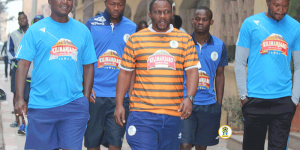 Kocha Mkwasa akiwa na makocha wenzake na baadhi ya wachezaji wa Stars jijini Nairobi.